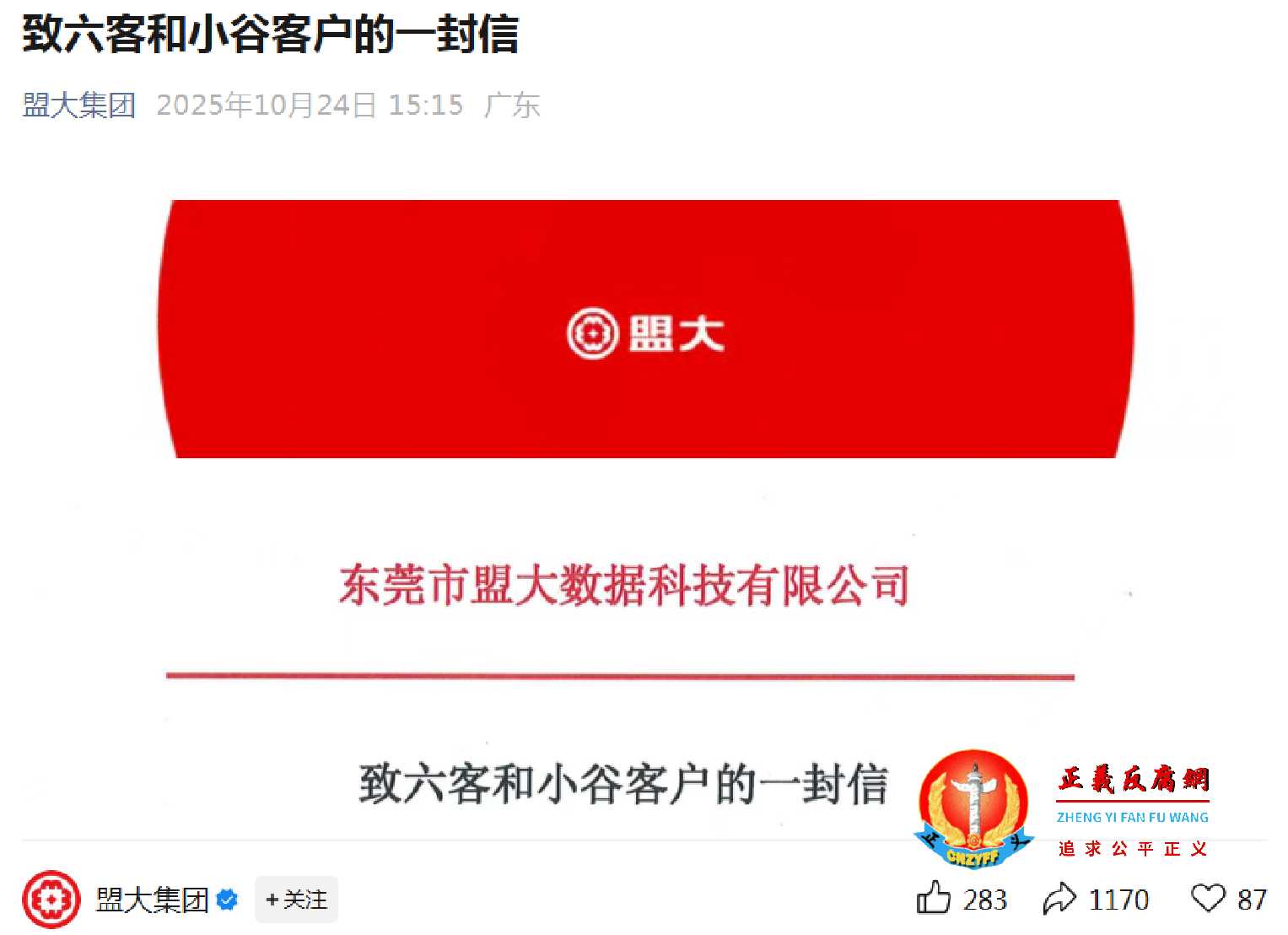 10月24日,盟大集团官方微信公众号发布了一封《致六客和小谷客户的一封信》。(图片来源:公众号“盟大集团”)
