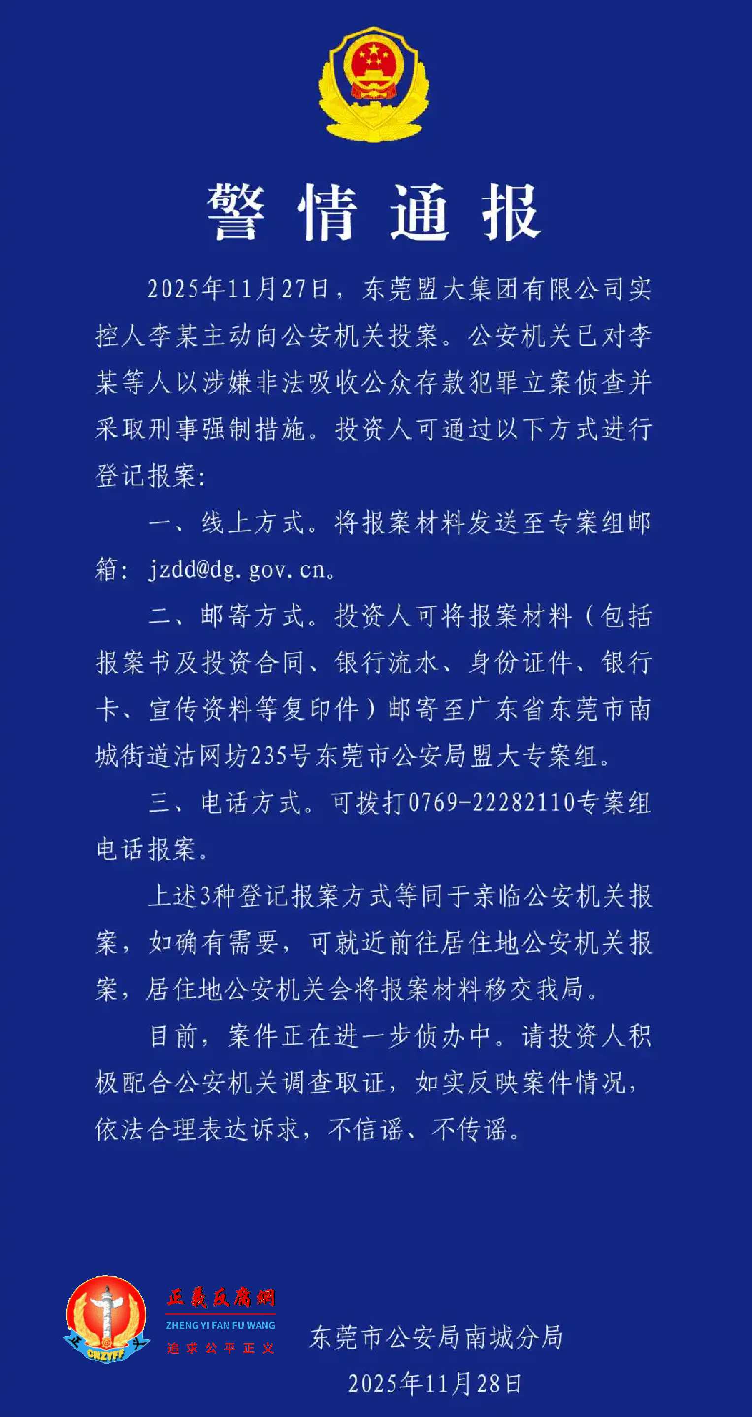 11月28日,广东东莞市公安局南城分局发布的《警情通报》称:“11月27日,东莞盟大集团有限公司(下称“盟大集团”)实控人李某主动向公安机关投案。公安机关已对李某(李实)等人以涉嫌非法吸收公众存款犯罪立案侦查并采取刑事强制措施。”并“请投资人积极配合公安机关调查取证,如实反映案件情况,依法合理表达诉求。”