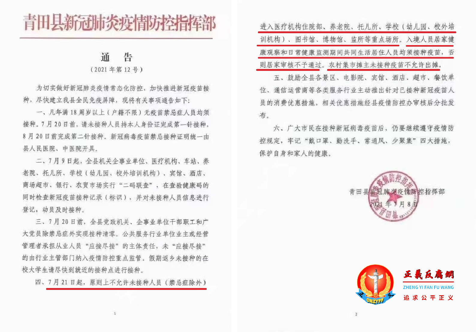 江西和浙江两省多地政府强制接种疫苗,不打不准进公共场所“坚决未纠正”