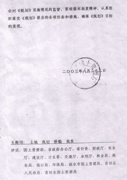 丽水市人民政府文件【丽政(2003)8号】签发人谢力群,丽水市人民政府关于青田县县内跨乡镇代保基本农田的请示,显示中去年该县仁庄镇和祯埠乡土地整理项目分别增加有效耕地36.69公顷和49.50公顷,这两个项目均已通过省国土资源厅验收【浙土整验字(2002)187号、210号】。为保持温溪镇乃至该县经济持续快速发展,特申请在县内跨乡(镇)代保基本农田58.22公顷,其中,仁庄镇代保15.22公顷,祯埠乡代保43.0公顷。