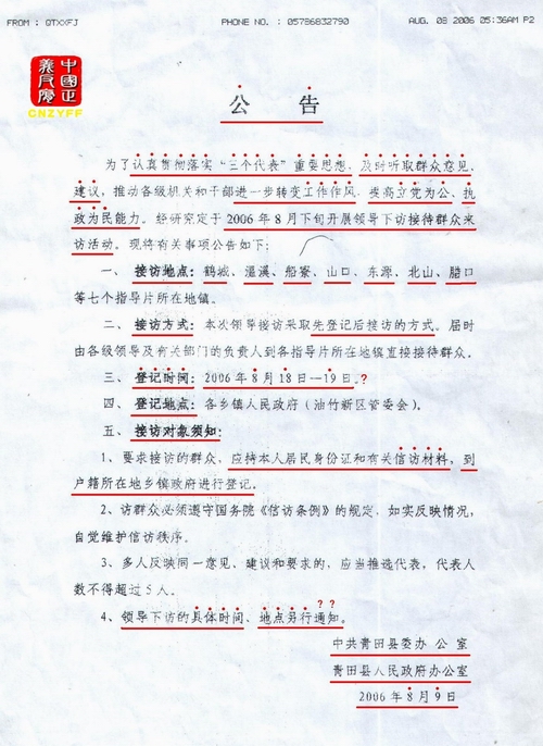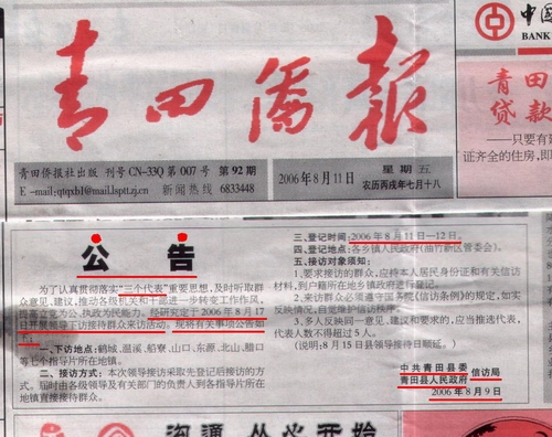 青田侨乡报刊登省领导下访通知《公告》上访人登记时间为:2006年8月11日—12日