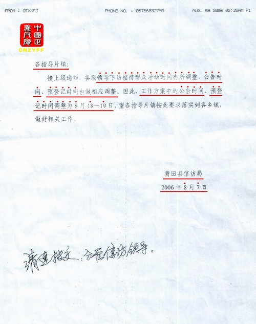 ▲浙江省领导下访通知《公告》上访人登记时间为:2006年8月18日—19日