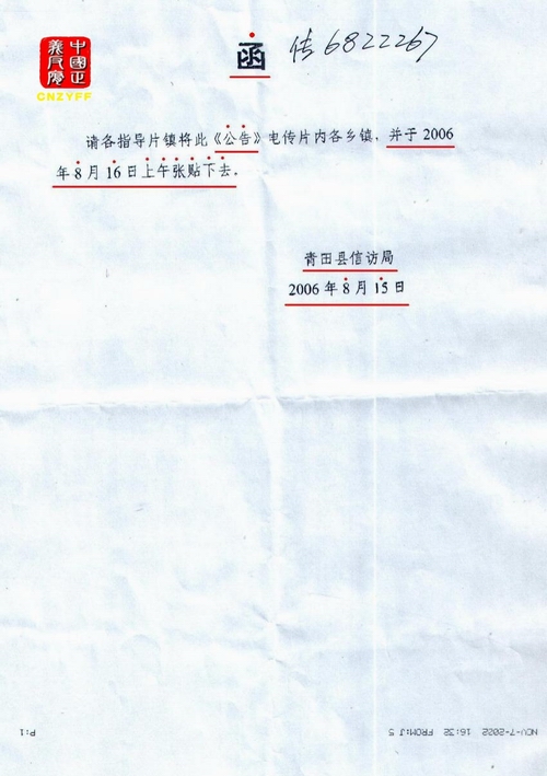 青田县信访局下函《公告》在2006年8月16日上午张贴温溪镇人民政府大门口的刚张贴出《公告》不到十分钟,《公告》不知无影无踪而飞。