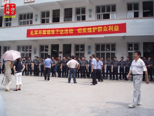 ▲图为青田出动警员,打着标语:“扎实开展领导下访活动,切实维护群众利益”