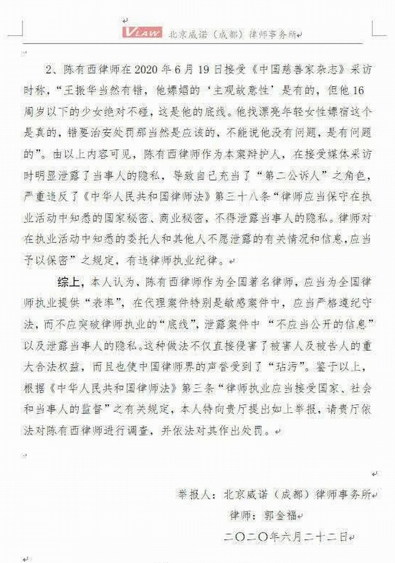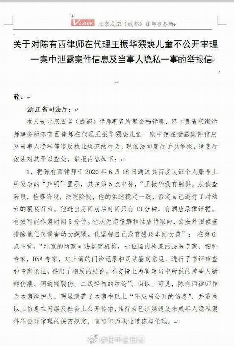 ▲2020年6月22日,北京威诺(成都)律师事务所郭金福律师向浙江省司法厅致《关于对陈有西律师在代理王振华猥亵儿童不公开审理一案中泄露案件信息及当事人隐私一事的举报信》。(微博截图