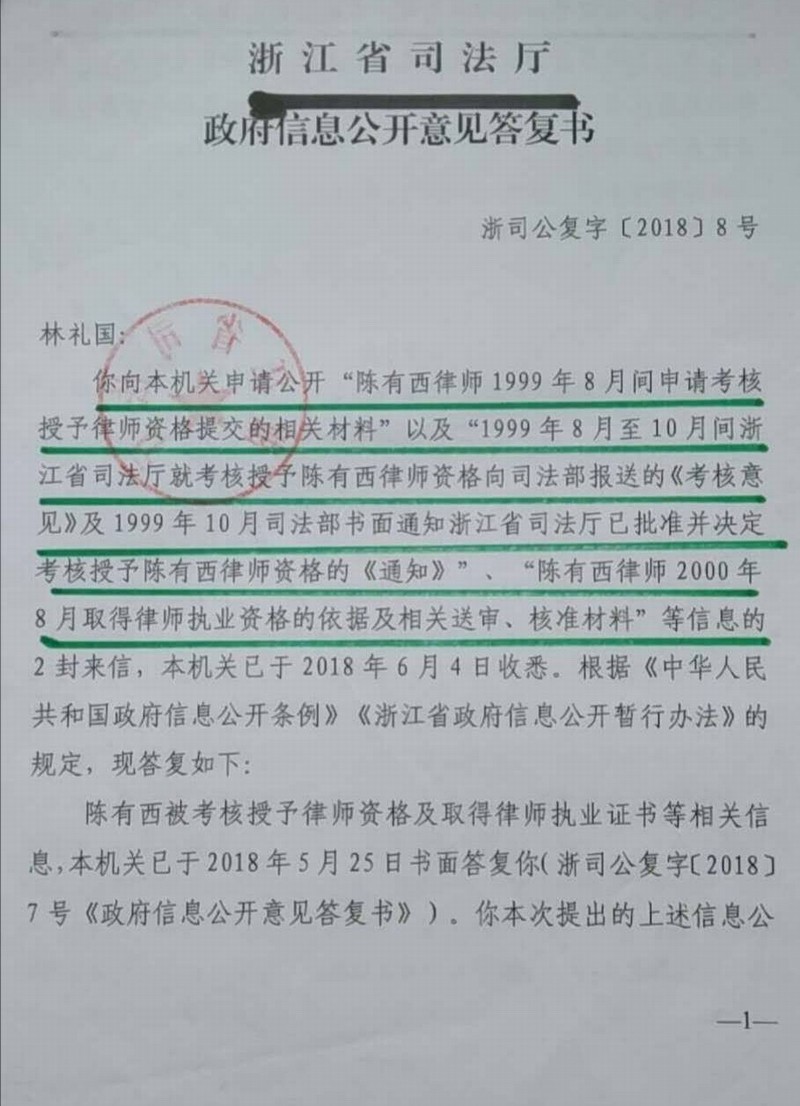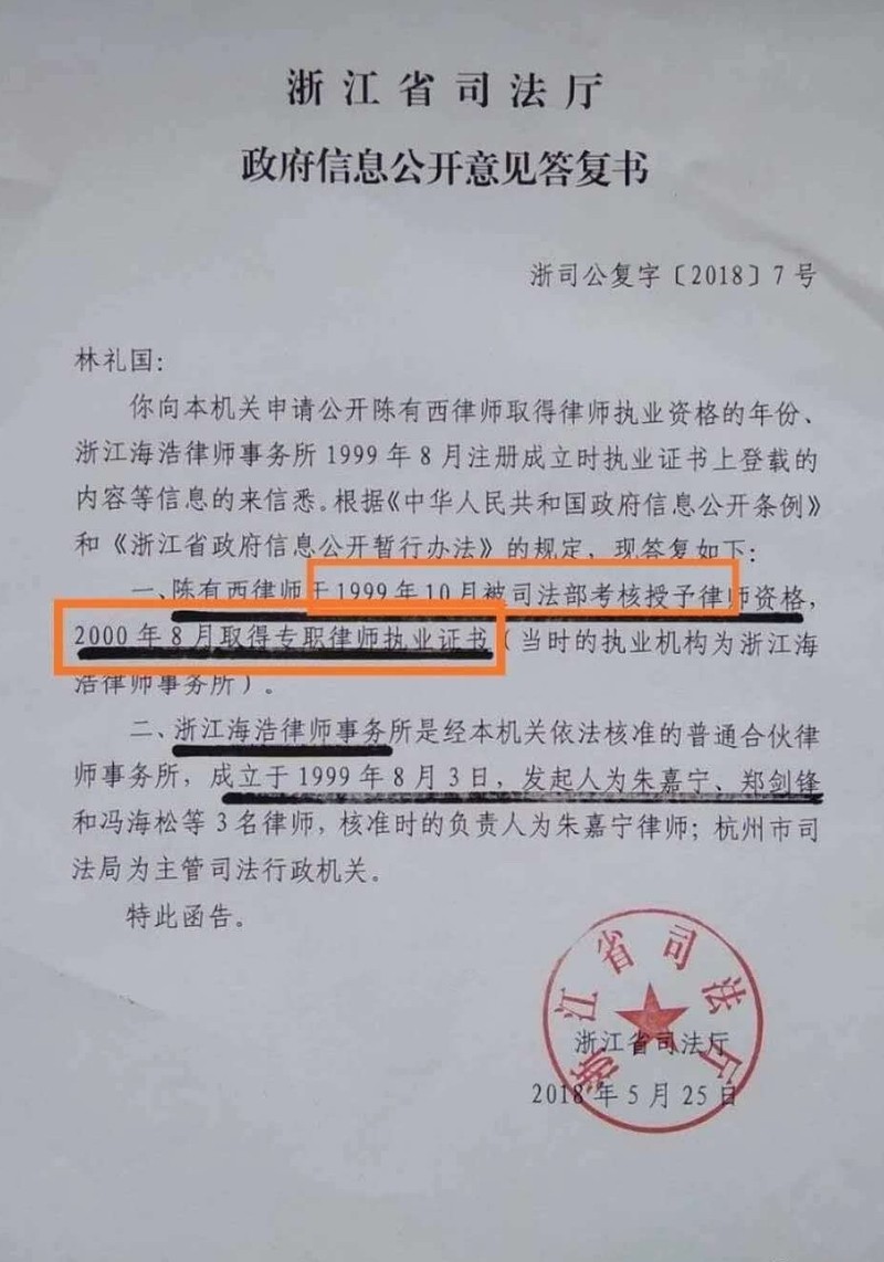 据浙江省司法厅2018年5月25日浙司公复字[2018]7号《信息公开意见答复书》答复独狼的信息公开申请,称:陈有西于1999年10月被司法部授予律师资格。众所周知,陈有西的学历是杭州大学(现浙江大学)中文系毕业(1977年(备注:1994年北京大学法律系高级法官班结业,不是学历),一句话:陈有西不具有“高等院校法学本科以上学历”这个可以授予律师资格的先决条件,其被授予律师资格违法,其律师资格依法应予注销。