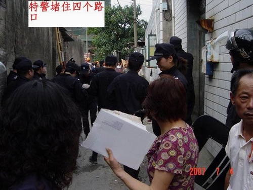 图为“官商”勾结“敢死队”堵住四个路口市民看强制拆迁“戏”