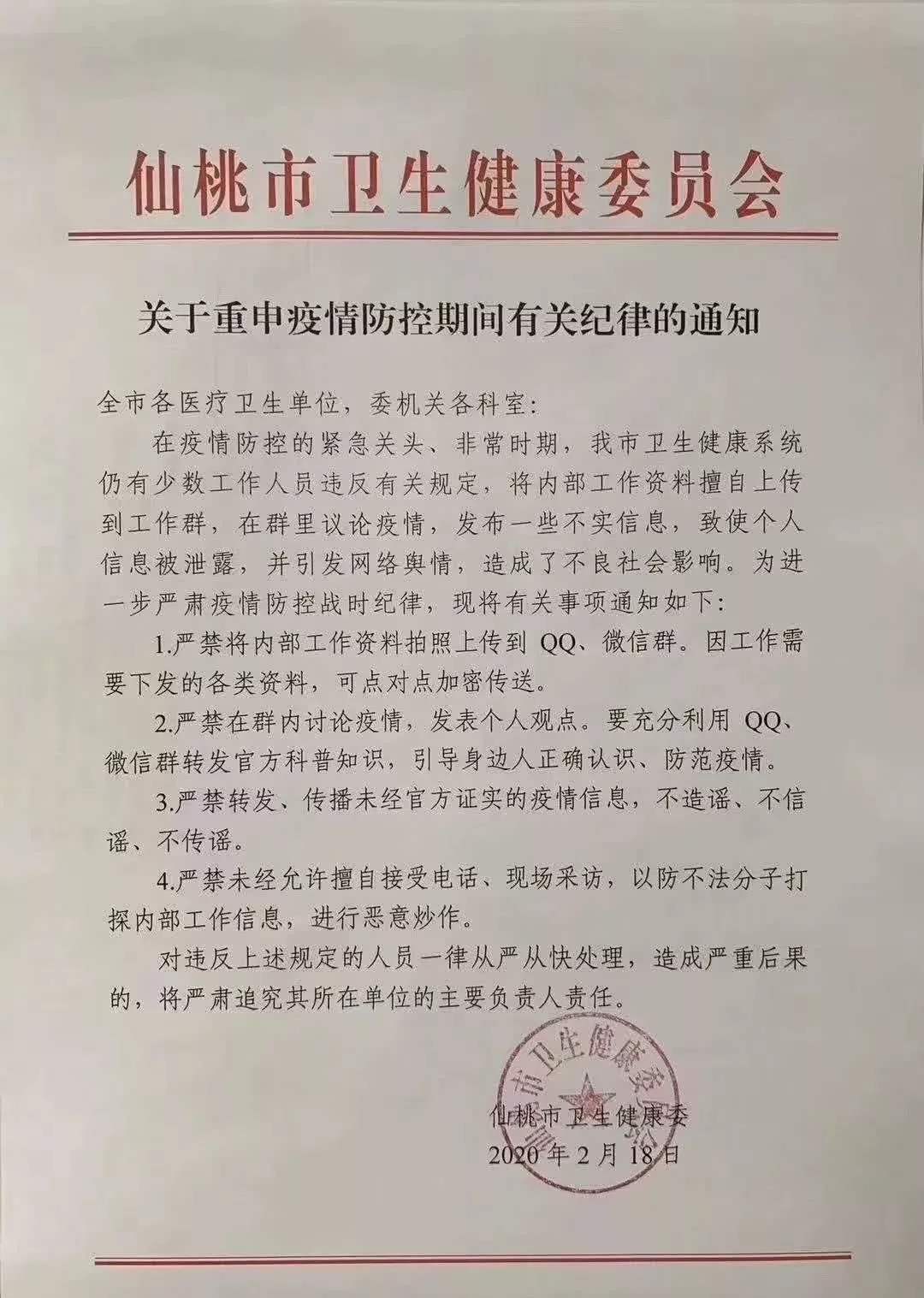 该《通知》强调了四点“严禁”要求,其中两点最易引发争议:严禁在群内讨论疫情,发表个人观点;严禁未经允许擅自接受电话、现场采访,以防“不法分子”打探内部工作信息、进行炒作。