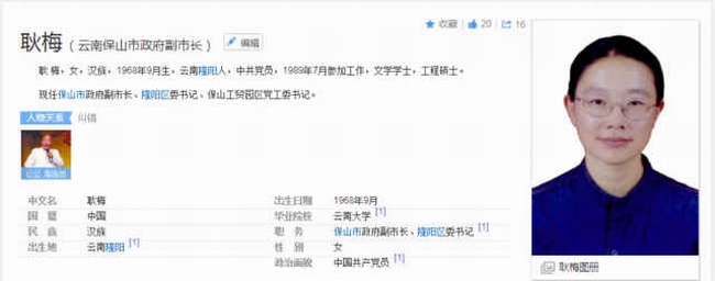官方公布的简历显示,耿梅,女,云南隆阳人,1968年9月生,毕业于云南大学中文系新闻专业。新闻记者出身,毕业后曾在媒体从业9年。1998年开启仕途,任施甸县水长乡党委副书记、乡长,后一步步升为保山市政府党组成员、副市长、隆阳区委书记。
