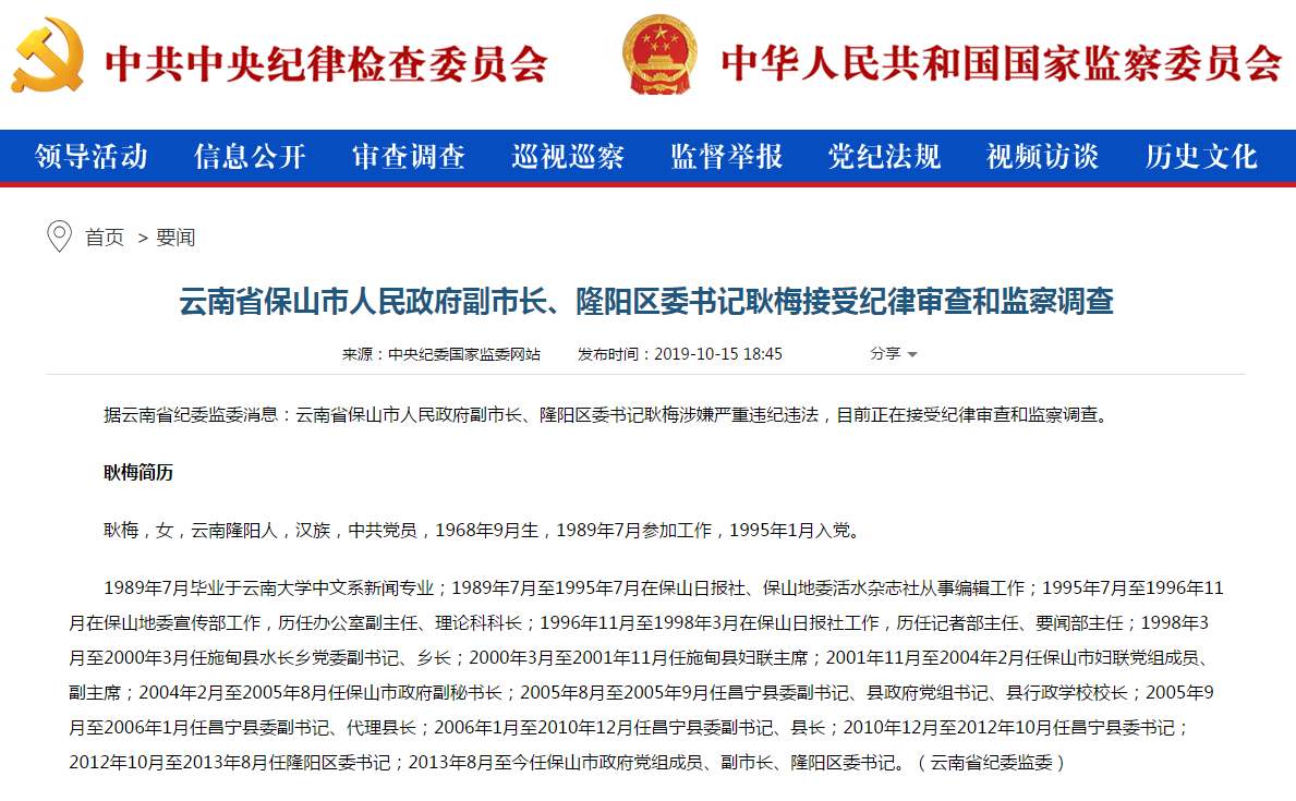 中国正义反腐网(www.zyff.org)、《反腐廉政月刊》杂志社北京讯:2019年10月15日据云南省纪委监委消息:云南省保山市人民政府副市长、隆阳区委书记耿梅涉嫌严重违纪违法,目前正在接受纪律审查和监察调查。