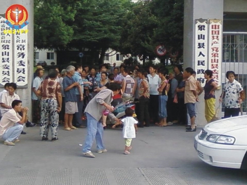图为中村民告状无门到县政府反映非法征地事情反而被保安阻止门口