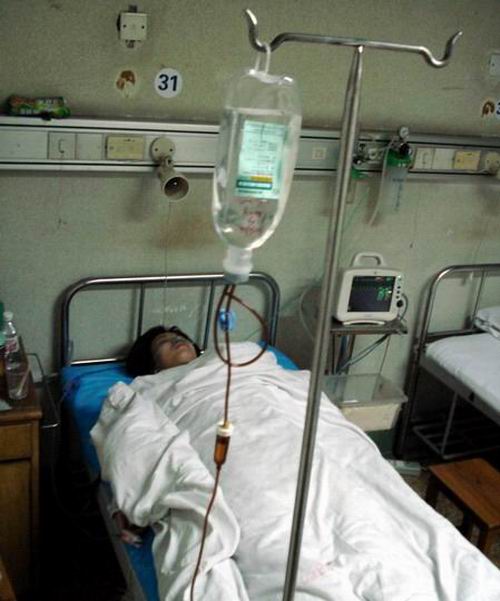 图为遭受羞辱和打击的刘敏身患癌症倒在医院病床上